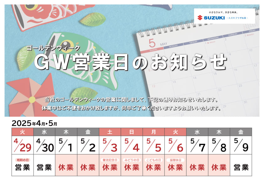 さて、スズキプラザ松原では年末年始の休業日につきまして、下記のとおり休業日とさせていただきます。